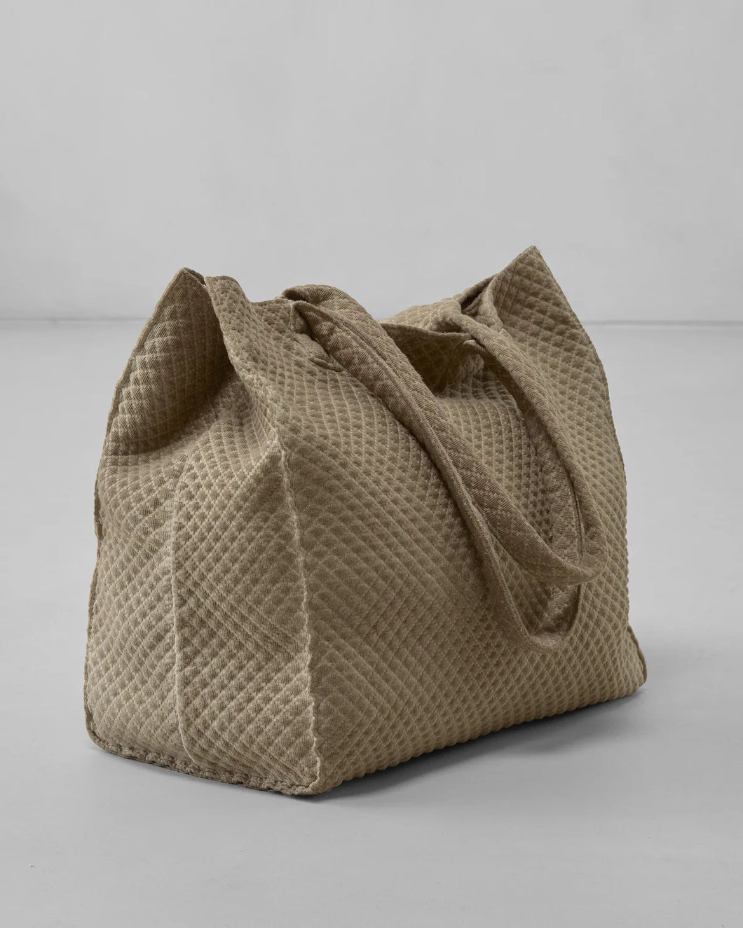 BUTI GEO cotton canvas bag features an embossed geometric jacquard motif, highlighting the irregular, free expression of maltinto. The texture of the fabric allows for the colours Grigio and Miele to be absorbed unevenly, letting the tones define shapes and volumes. Soft and versatile, this bag reinterprets the iconic DRAI HANG bag in a vintage key.